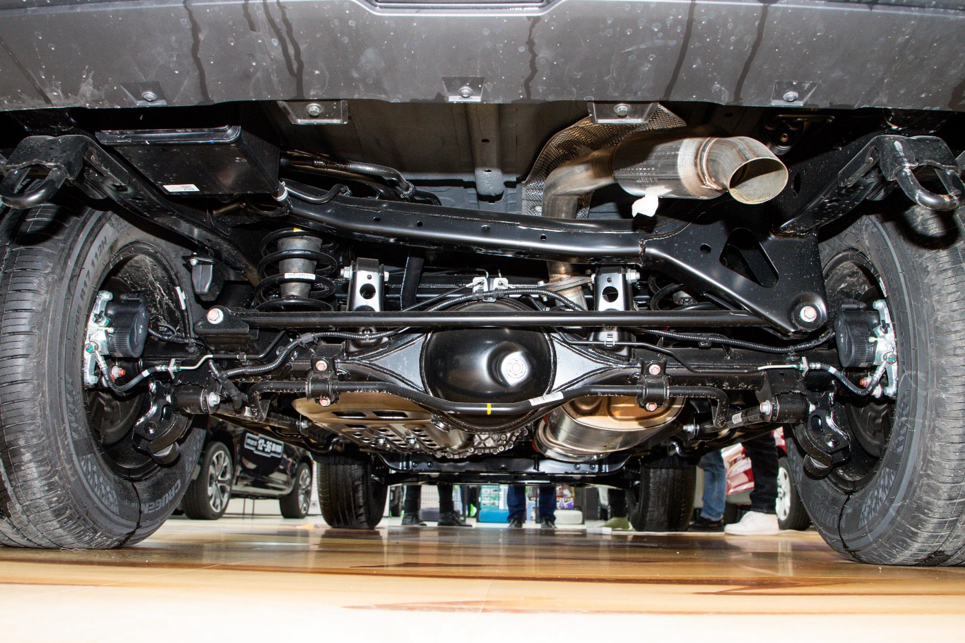 底盘悬架采用前双叉臂式独立悬架,后多连杆式非独立悬架的组合,并配备博格华纳的分时四驱系统,配和前后差速锁,拥有多种驾驶模式。