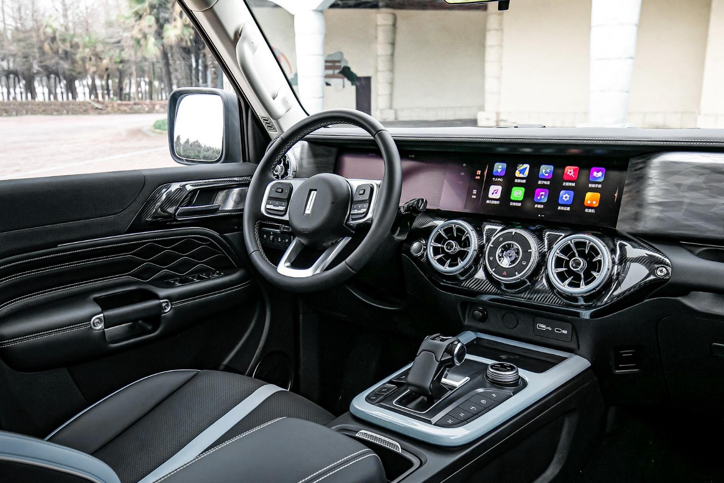 内饰整体依旧是硬派的风格,其中圆形的空调出风口也是WEY品牌此前车型上常见的设计元素,副驾驶正面位置还采用了带花纹的饰板,下方还搭配了专属把手,这种设计也只有在硬派SUV上才能看到。