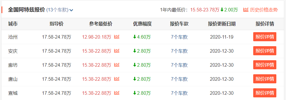价格方面,阿特兹的指导价是17.58-24.78万元,放在同级运动型车里价格不便宜。不过,阿特兹这两年一直都有优惠,加上最近“异响门”闹的动静挺大,所以目前它的优惠增加了。就以河北沧州地区为例,目前阿特兹的最高优惠幅度就达到了4.60万,而且这还是全系车型都有的优惠,如此一来,入手一台阿特兹最低配裸车的价格也就仅需12.98万元了,降价幅度相当诱人。总之,阿特兹是20万级运动型车里的代表,喜欢开车的朋友们不妨就认准它。