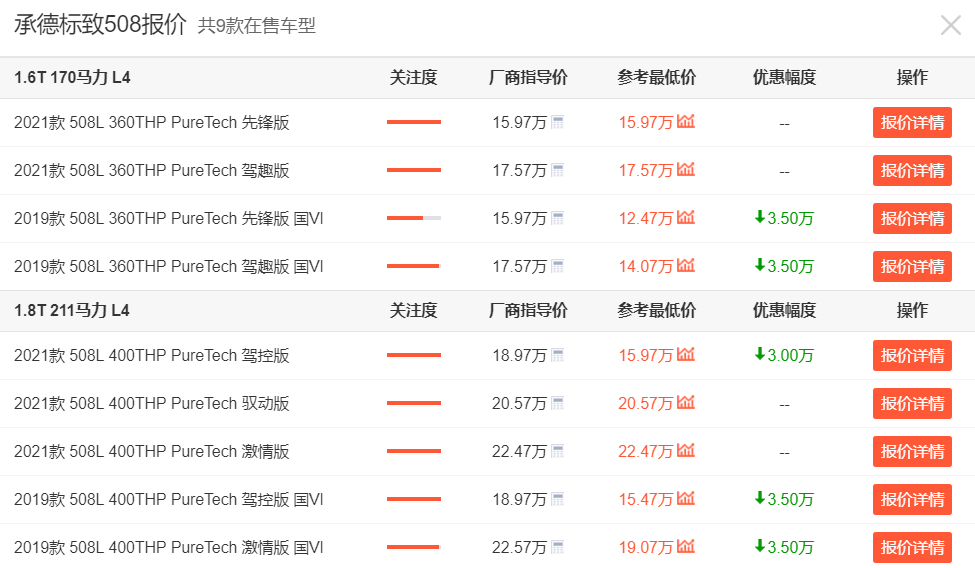 价格方面,标致508L的指导价是15.97-22.47万元,放在同级运动中型车市场里属于价格偏低的车款。好在的是,如今标致508L终端价格有所松动,在河北承德地区,标致508L现在的最高优惠就来到了3.5万元区间。虽说能有这一优惠的车型都是2019款,但鉴于其也是国六排放,因此想买的朋友还是值得入手的,建议大家可以去当地了解看看。