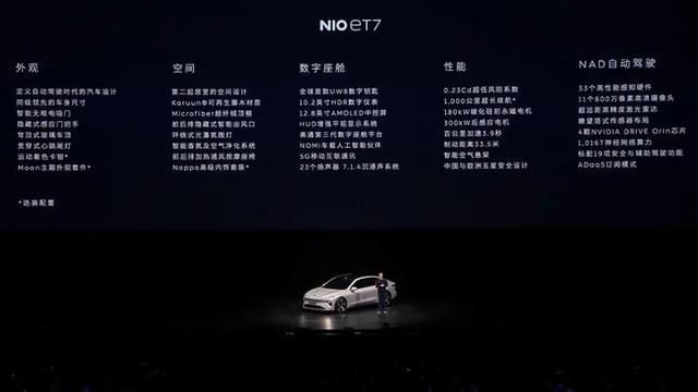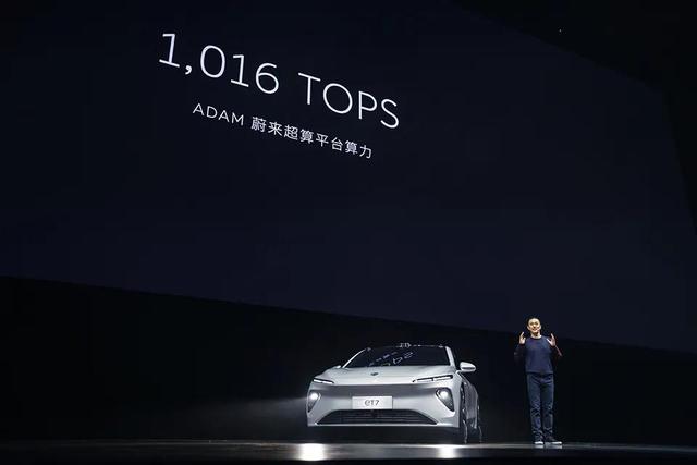 回看2021年1月9日 NIO Day,当李斌站在ET7身边时,蔚来的最新技术平台下的首款车型蔚来ET7 (配置|询价)所有信息公布,背后的大屏上一次性密密麻麻的展示出新车全部核心亮点时,确实振奋人心:AMOLED、NOMI Mate 2.0、第二代电驱平台、智能空气悬架,这些全部配齐不过是开胃菜。800万像素(特斯拉6倍多)摄像头+超远距离高精度激光雷达、高达1016 TOPS的超算平台(特斯拉7倍多、150kWh准固态电池技术