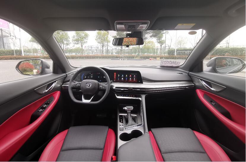内饰采用家族式横向布局设计,银色装饰件贯穿左右,延伸至车门音响面板。同为10.25英寸的液晶仪表和中控液晶触摸屏组成双联屏嵌入中控台,设计简约视野开阔。空调实体按键被安排在出风口下方,与档把后的全景影像按键通过银色饰条延副驾扶手外侧连接,造型别具一格。黑红双拼色的座椅包裹性到位,和同为黑红双拼色的门板打造车内运动氛围。