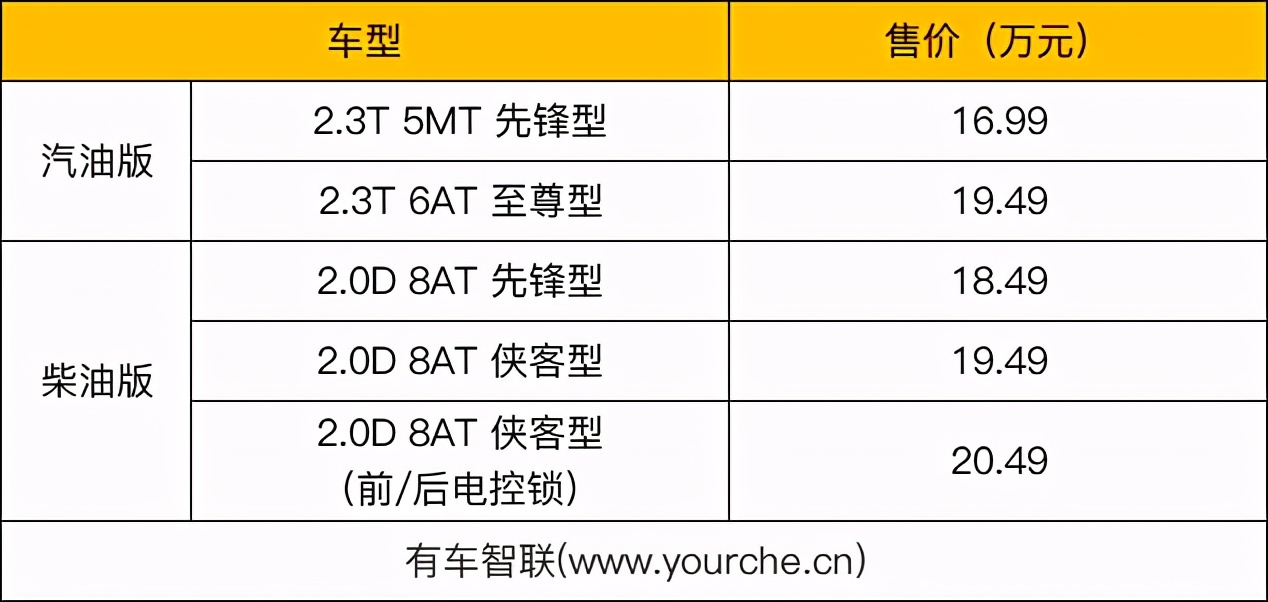 据介绍,新车采用了非承载式车身结构,并配备电控分时四驱系统,能够将动力以50:50的比例平均分配到前后轴,从而让新车具有更好的行驶稳定性。值得一提的是,新车拥有37°接近角、31°离去角以及23°的纵向通过角,涉水深度达750mm,另外,在2.0D 8AT 侠客版车型上还配备了前/后电控锁,进一步提升了其越野性能。