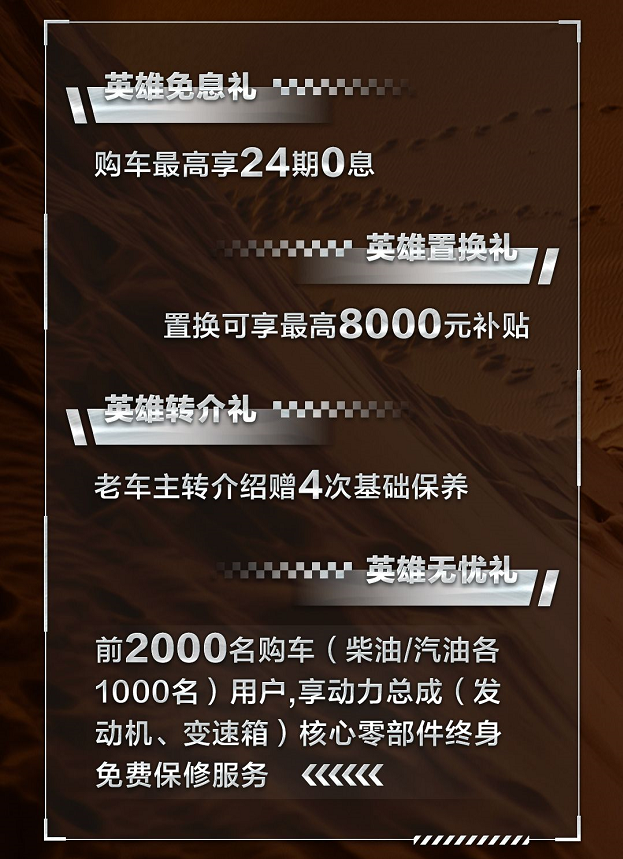 优惠政策方面,官方为该车提供了4重豪礼,购车至高享24期0息、置换可享至高8000元补贴、老车主转介绍赠4次基础保养、此前,前2000名购车(柴油/汽油各1000名)用户还可享受动力总成(发动机、变速箱)核心零部件终生免费保修服务。