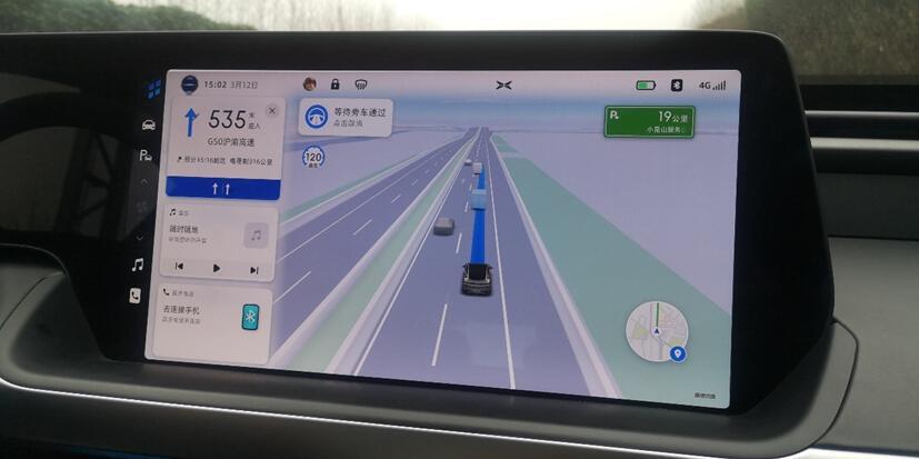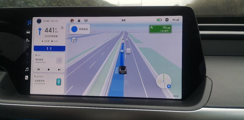 在切换高速或下高速的过程中需要进入到匝道,小鹏P7上的NGP让人印象深刻。由于进入到高速以后NGP会优先选择最左侧道路行驶,所以距离匝道出口还有大概2km时,NGP语音便会提醒驾驶员并开始进行向右变道的操作。在变道过程中很平稳,也并未出现连续变道的行为,而且在向右变道的过程中可根据前车情况在变道的同时平稳减速。