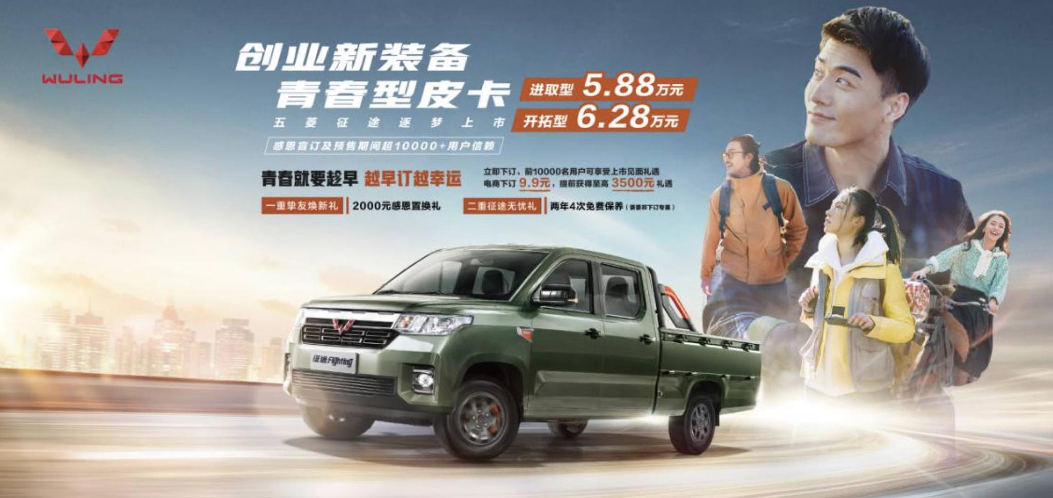 迈入2021,五菱“搞事情”的节奏仍未停下,开始进军皮卡蓝海市场。3月18日,五菱品牌旗下首款青春型皮卡——五菱征途 (配置|询价)正式上市,新车推出进取型、开拓型共2款车型,官方指导价分别为5.88万元、6.28万元。