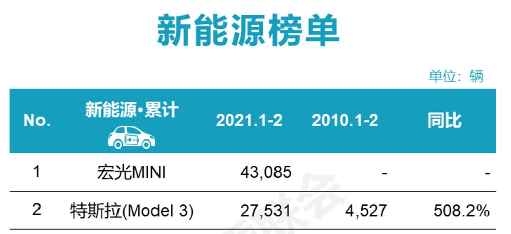 汽车市场里的竞争永远都是你争我赶的,这不,在今年的1-2月份时间里,五菱宏光MINI EV车型便再次获得了新能源汽车市场的销量冠军。而其也以43085辆的新车销量表现,超越了新能源汽车领域去年的销量霸主特斯拉Model 3 (配置|询价)(27531辆)。