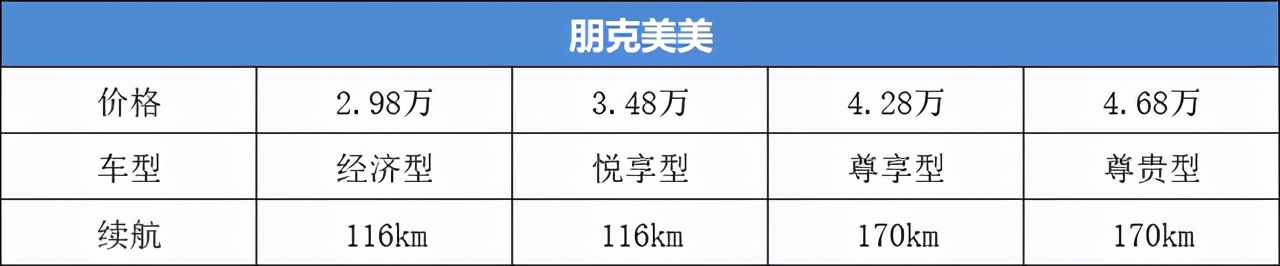 细看这款朋克美美的车型定价我们会发现,其指导价与宏光MINIEV车型其实是差不多的。宏光MINIEV指导价2.88-3.88万元,朋克美美定价2.98-4.68万元。宏光MINIEV全系3款车型,朋克美美全系4款车型。怎么样,看到这会发现它有点想要和宏光MINIEV对着干的意思了吧。