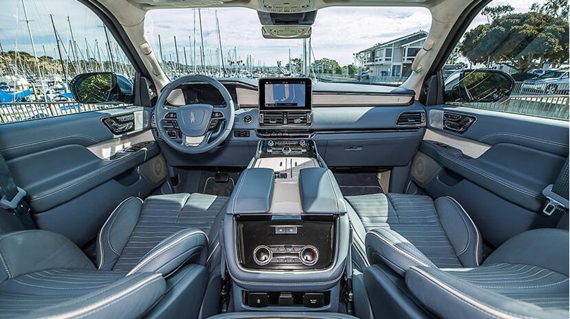 内饰的设计也堪称“豪放”。车内,但凡身体能触碰到的地方,均由软皮质包裹,质感细腻无比。钢琴键式的电子换挡按键,配合上雪柚木饰条,一同营造出十分高级的内饰氛围。最值得一提的是,领航员的主副驾驶均支持30向调节,像座椅记忆/通风/加热/按摩这种更高阶的功能,也一并没有落下。至于智能配置嘛,对于一台定价上百万的车款,市面上较为主流的配置均囊括在内,如HUD抬头显示、12.3英寸液晶仪表、自带10英寸的SYNC