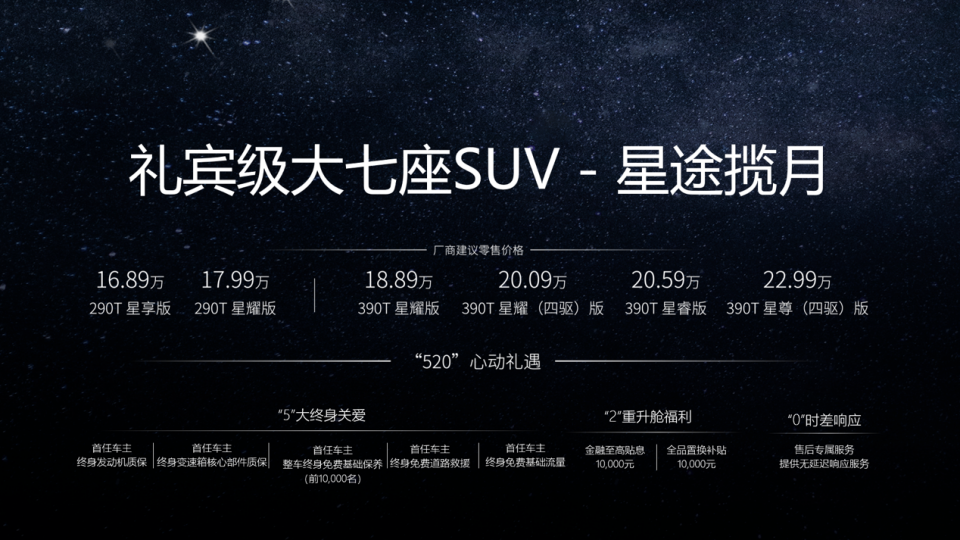 发布会上,星途营销中心常务副总经理叶磊还宣布了用户购车的“520”星动礼遇:首任车主可享5大终身保障,发动机终身质保、变速箱核心零部件终身质保、整车基础保养终身免费、终身免费道路救援以及终身免费基础流量;此外,订购星途揽月可享金融至高贴息10000元和全品置换补贴10000元“2重升舱福利”,更享售后专属服务和无延迟响应服务的“0”时差响应礼遇。