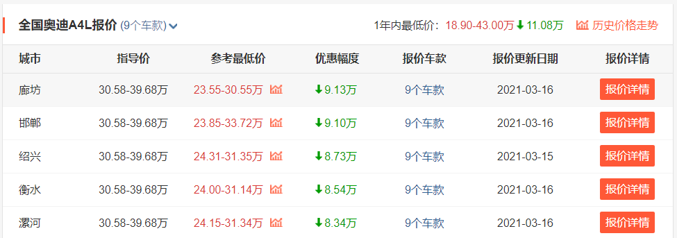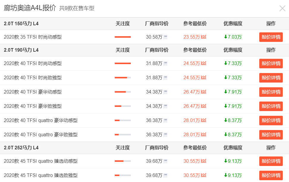 说到抄底,奥迪A4L肯定也是一个非常好的选择对象。虽说在售的奥迪A4L在不久前才完成中期改款,但对于不管新车老车优惠幅度都差不多的奥迪车系来说,其实无论什么时间段买它的优惠都是很大的,所以既然是要抄底买车,那奥迪A4L绝对也不能错过。
