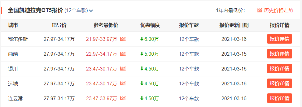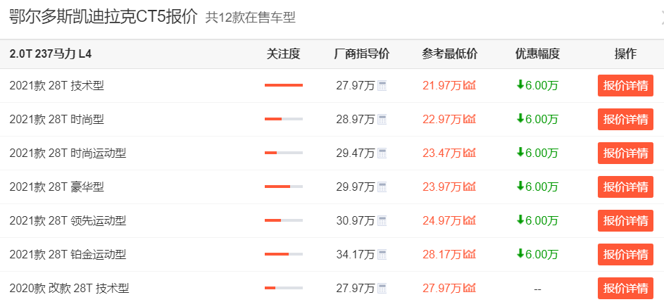 价格上,凯迪拉克CT5的指导价是27.97-34.17万元,由于上市时间已经有一年多时间,所以目前CT5在鄂尔多斯地区的参考最低价也来到了21.97-33.97万,最高优惠拥有6万元,算是相当大的一个优惠力度了。不过这里又要说到的是,在全国其它地区CT5的优惠普遍在4-4.5万之间,因此具体大家还是得根据当地经销商的优惠情况来看。总之,凯迪拉克CT5拥有大几万优惠是不争的事实,对于喜欢美式运动型车的人来说,CT5可能是最好的选择了,因此也值得入手。