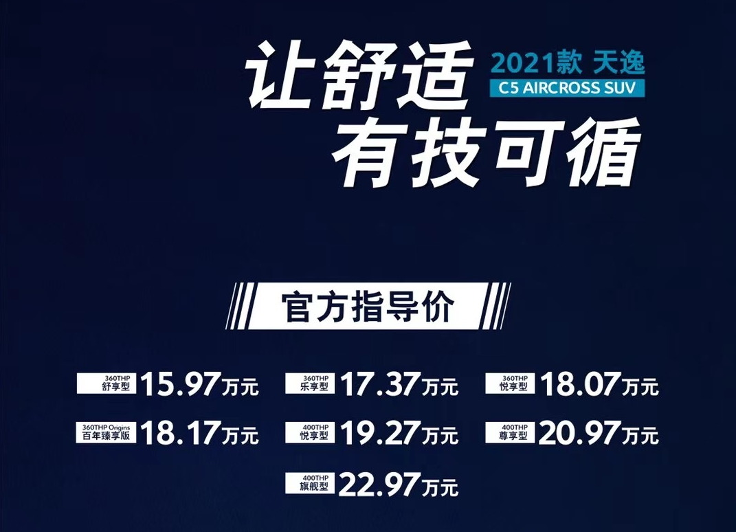3月19日下午,东风雪铁龙2021款天逸 (配置|询价)C5 AIRCROSS正式上市,新车共推出7款配置车型,售价区间为15.97万-22.97万元。作为年度改款,新车主要针对部分车型配置进行了调整,8AT变速箱成为全系标配,动力方面,新车提供1.6T和1.8T两种动力总成,其中1.8T车型售价得到进一步下探。