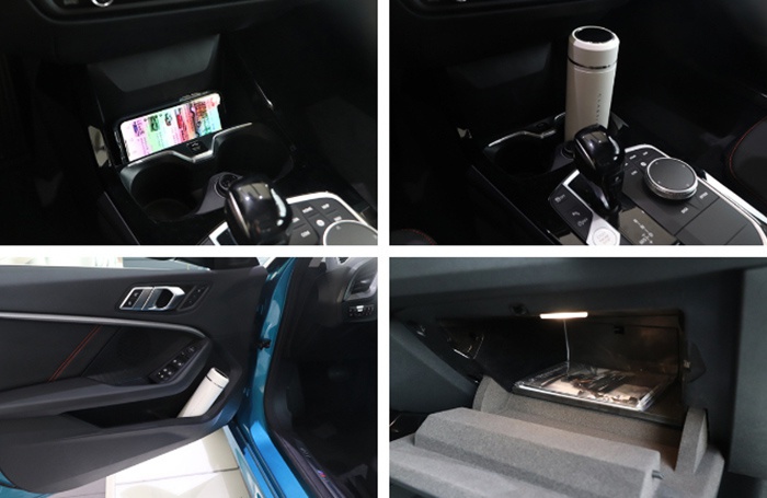 储物空间层面,宝马2系Grand Coupe只能算将将够用。前排部分门板内侧有两块做了分区处理的储物空间,可以用来放置水杯及毛巾,纯硬塑料的材质在实际使用时有可能为车里带来异响,如果能够在内侧铺上绒布就好了。至于挡杆区域,常规的两个不带限位器的杯架以及手机放置区能够基本满足日常需求,高速卡等小物品也能够放在手机放置区,并没有太大问题。