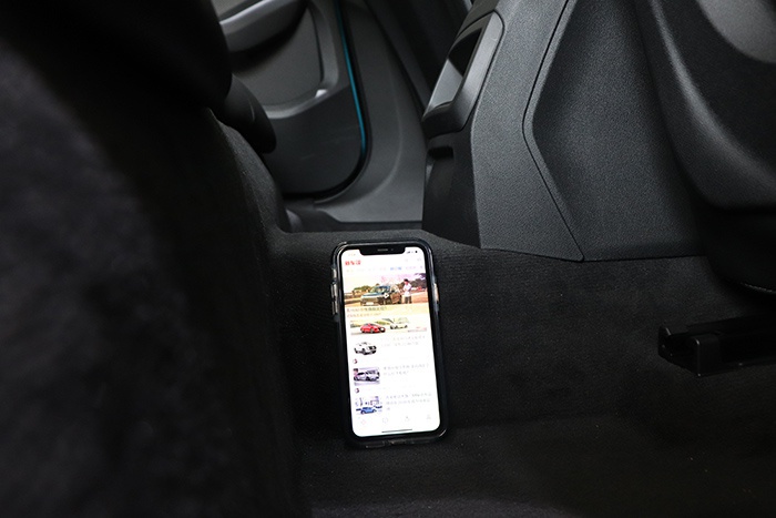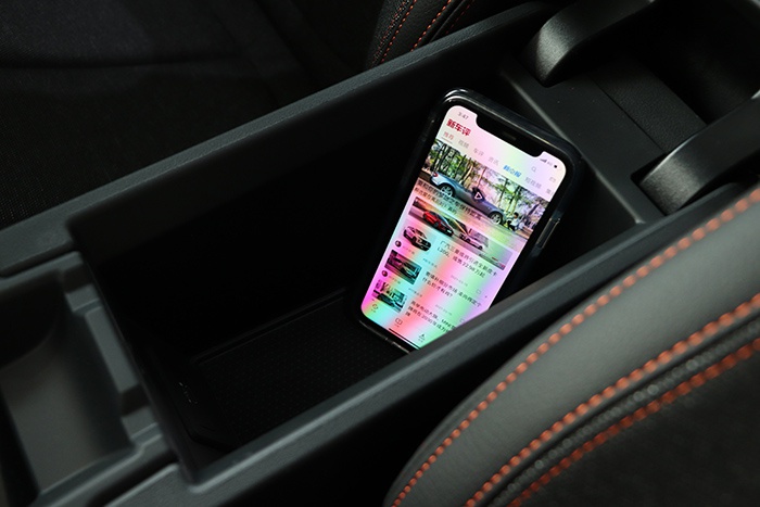 至于中央扶手箱容积,老实说就有一些小了,以5.8英寸的iphone11为例,刚刚好能够将中央扶手箱铺满,深度也刚好和iphone11立起来齐平。这样的容积,基本上放置两三件物品一个钱包就满满当当了,对于随身物品的放置还是有些不方便了。