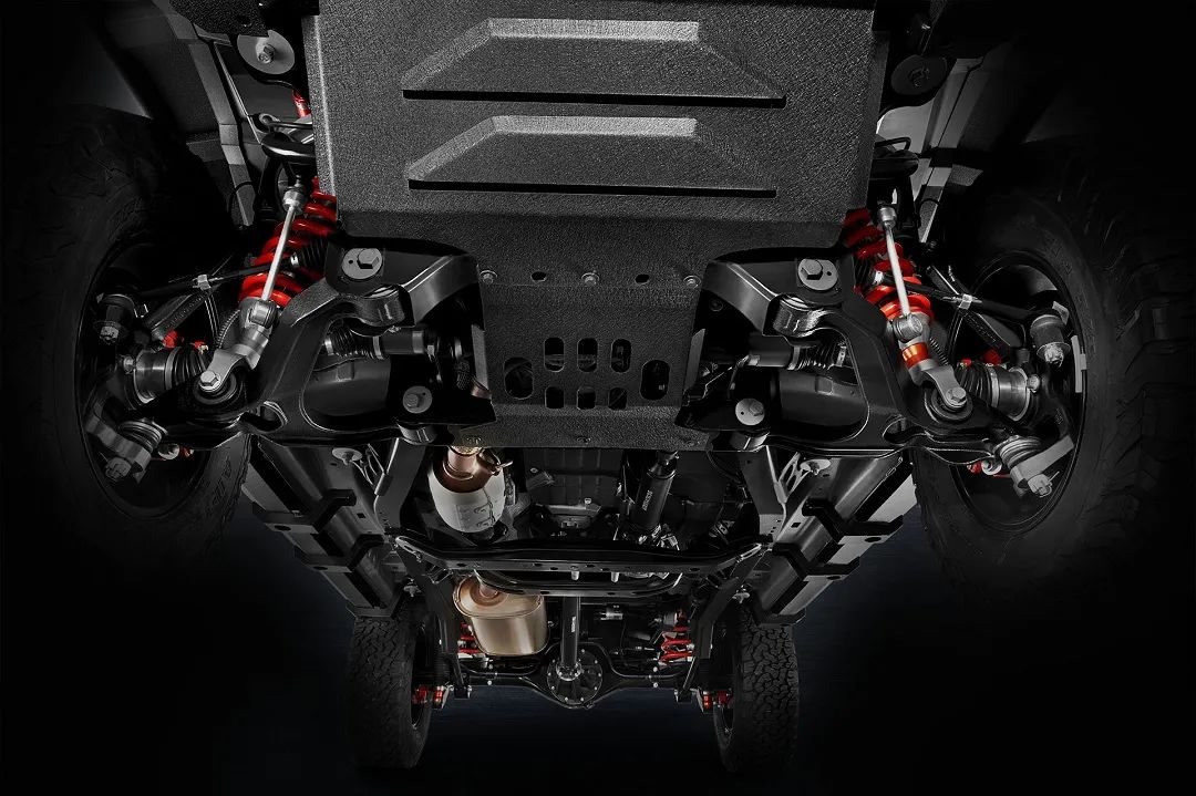 底盘方面,雨林穿越版车型针对穿越路况进行打造,悬挂方面配备了23段可调氮气减震,离地间隙更是提升了75mm,不仅可以根据不同路面对减震的软硬进行调节,更高的离地间隙也让其拥有更好的通过性。并且经过加强后的上支臂强度更是提升了40%,对于穿越车型来说,安全到达目的地才是最重要的,虽然全车重量相比之下更沉,但是它可以给你提供更放心的保障。