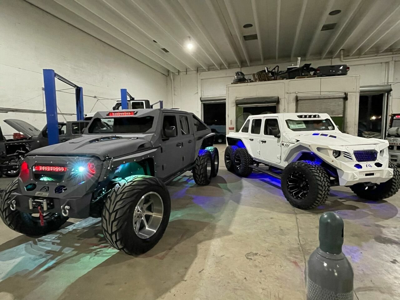 列表中没有提到Hellfire是基于Wrangler (配置|询价)还是Gladiator,但无论哪种方式,你总会注意到它的特点是第三轴和有六个轮子。在外观上也进行了大量的改动,包括在车头、车侧和车尾都安装了新的面板。由于定制的格栅和LED灯条,前部特别大胆,甚至在挡风玻璃周围还有一个定制的护罩。