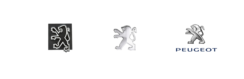 从左至右分别是标致1975年、1998年和2010年的品牌标识