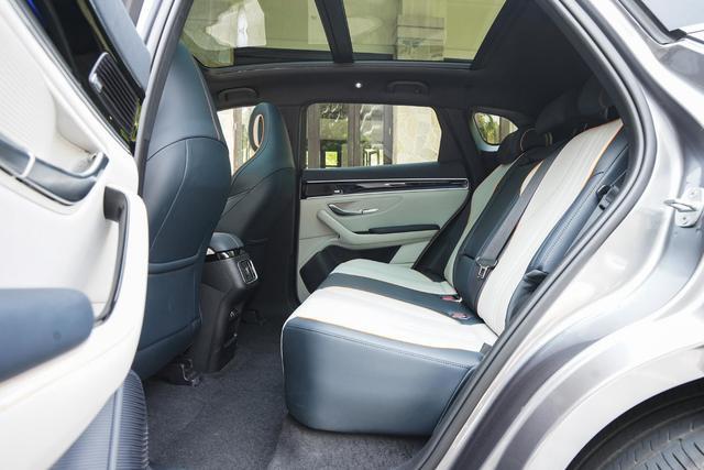 前排座椅采用了一体式运动化设计,主副驾驶具备6向电动调节,高配车型还具由加热/通风功能,这可是燃油版有没的配置,整个座椅可以说包裹性和乘坐舒适都表现不错。后排空调出风口没有缺席,提供了两个USB充电接口和一个储物格,并且中间地台也是纯平的。