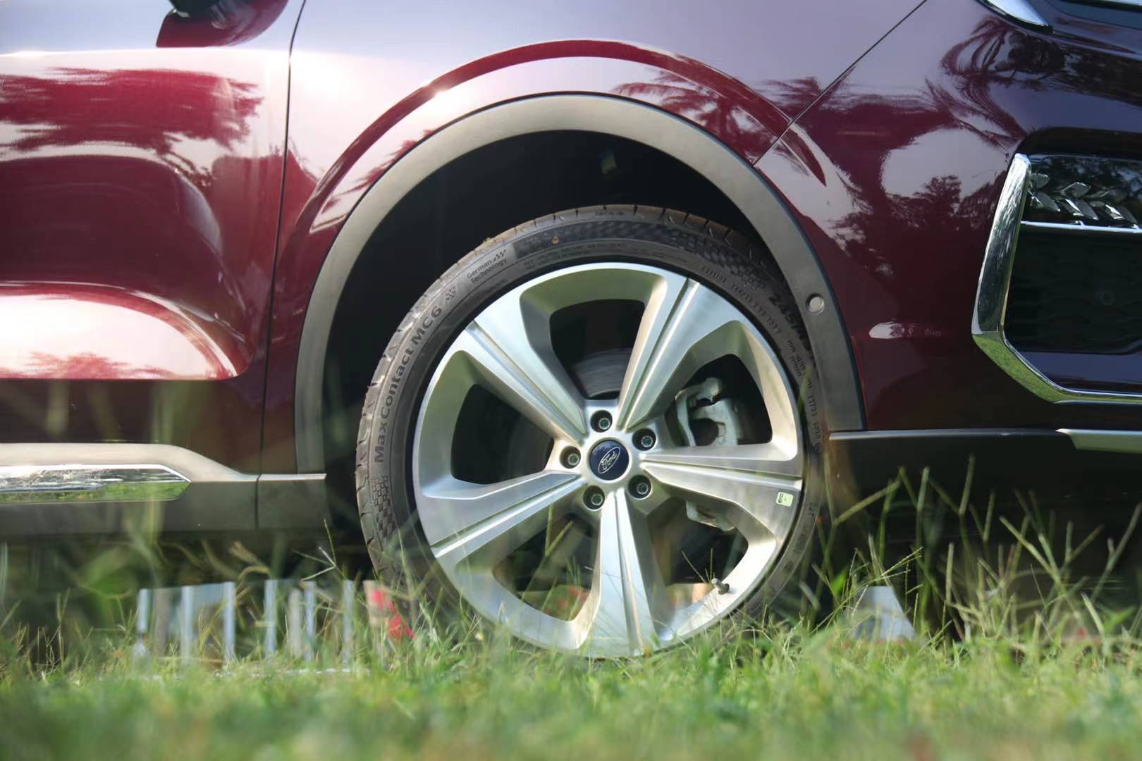 车身侧面,领裕运用了大量的平直线条设计,整体车看上去非常修长,风阻系数仅为0.34Cd。其中前脸和车尾线条与地面的角度接近垂直,而车顶线条也与地面接近平行,整体造型十分魁梧。在车身尺寸方面,领裕的长宽高分别为4905/1930/1755mm,轴距为2865mm,整体车身尺寸介于同门的锐界 (配置|询价)和探险者 (配置|询价)之间。轮胎方面,领裕采用了德国马牌轮胎,20英寸的铝合金轮圈让整车看起来非常动感。