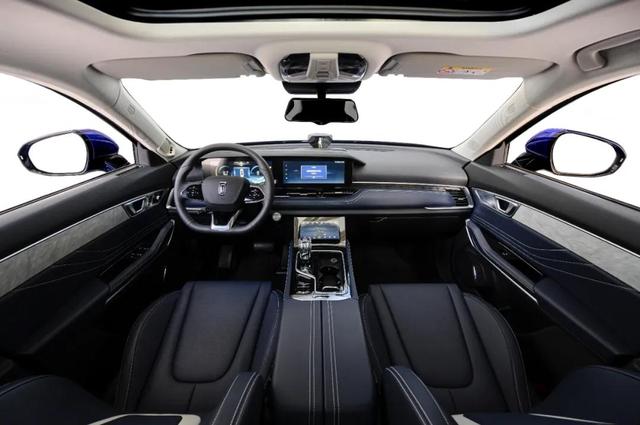 内饰部分围绕贯穿式双12.3英寸连屏展开,辅以错落有致的中控台造型,能显示出一定的豪华感。同时,T字区布置了触摸式的空调控制面板和电子换挡机构,增添不少科技气息。
