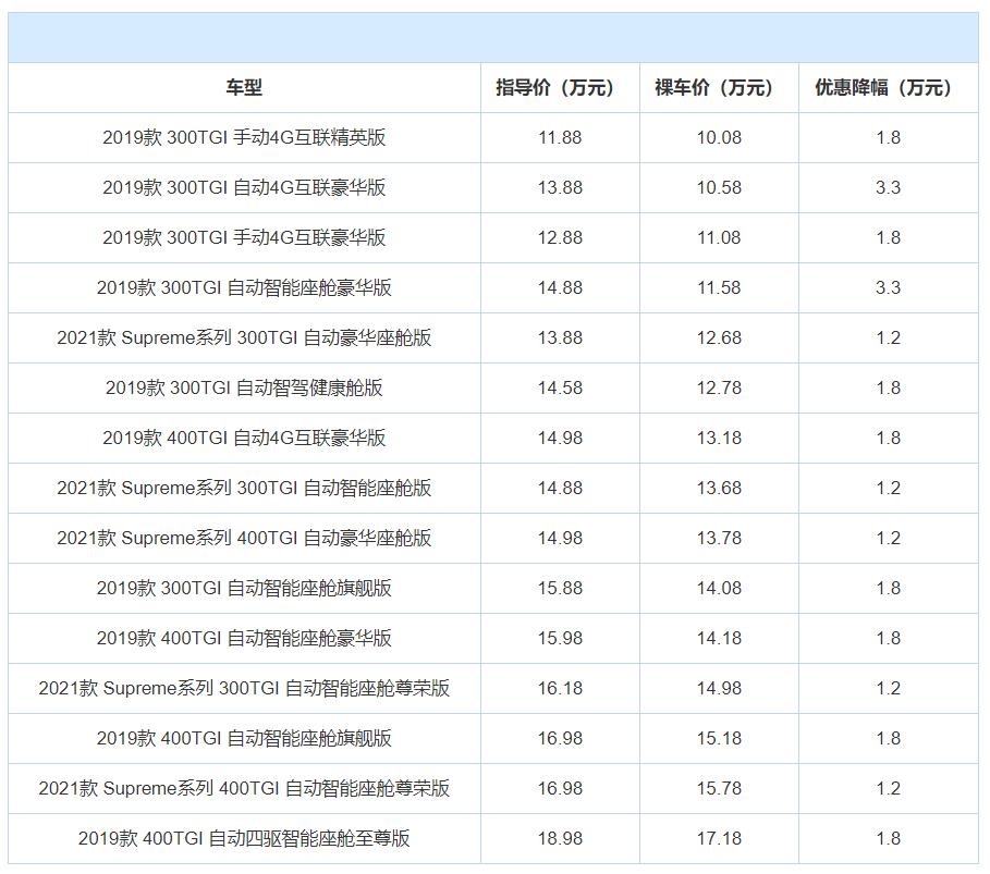 动力方面,荣威RX5 MAX搭载了一台1.5T涡轮增压发动机和一台2.0T涡轮增压发动机,最大功率分别为173马力和231马力。传动则是匹配的6挡手动、6挡手自一体以及6挡湿式双离合变速箱。价格上,荣威RX5 MAX目前最高可享3.30万元现金优惠。相当于打了7.6折,整体优惠还是挺高的。当然,这一优惠也不是全系车型都有,我们了解到,这番优惠主要存在于2019款 300TGI 自动4G互联豪华版、2019款 300TGI 自动智能座舱豪华版等车型身上,其它车型则只有1.2-1.8万不等的优惠,因此想买它的朋友也要注意了。