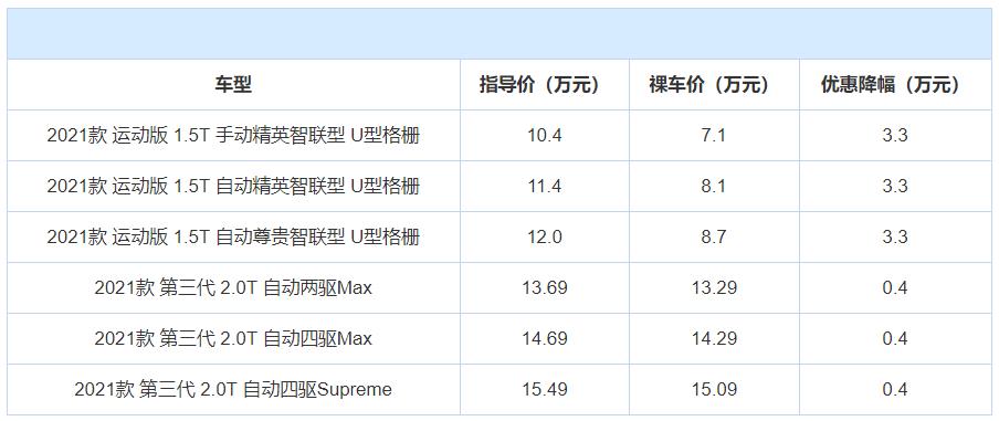 如今,哈弗H6已经来到了第三代车型,在售的2021款车型里也分布着几十款细分车型,所以真要买车的话,它也总能让你挑选到一台合适的车型。而从价格端来看,哈弗H6目前也是最高可享3.30万元现金优惠。相当于打了6.8折,优惠是挺大的。当然也需要注意一点,那就是拥有此优惠的车型是2021款 U型格栅车型,像其余的第三代全新哈弗H6则只有4000元的优惠,因此想买的朋友可也得搞清楚了。