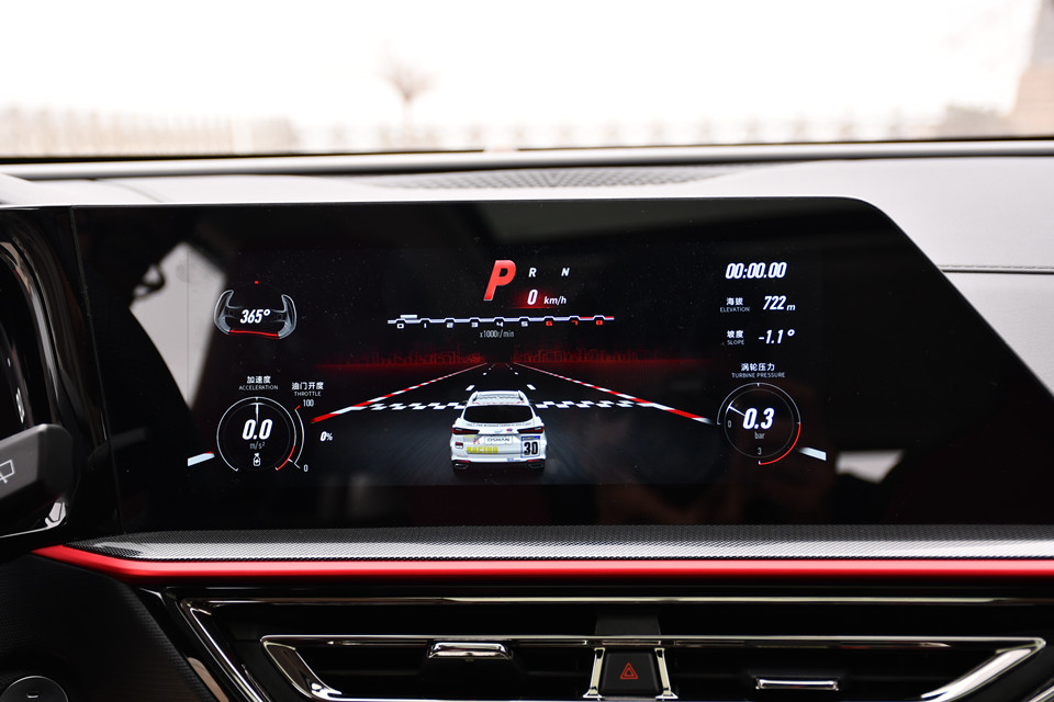 长安欧尚还拥有赛道模式,驾驶员只要需要对着仪表盘上的摄像头比个OK手势,系统就可以自动切换到赛道模式,这时中控屏区域会显示出坡度、海拔、油门开度、涡轮压力等信息,配合车内模拟出的赛车式音浪,体验感不错。