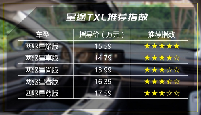指导价13.99万元的星尚版,刚说了“起步即高配”,虽然是星途TXL的入门车型,但该有的便利性、舒适性配置和现在主流同价位能买到的配置相比,是有过之而无不及的。作为家用,它有什么缺失吗?我看了一圈,导致你天天用车觉得很不方便的基本没有,硬要说就是没有原厂的行车记录仪,这个后期自己装比较方便,成本也不高。所以,在这一预算区间,您就放心买吧,中型SUV没有比它更划算的了,推荐指数3颗星,主要是相对于同系列的另外两个更佳的选择来说。