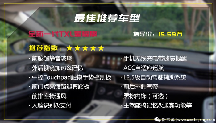 从性价比的角度出发,我们认为指导价15.59万元的星耀版推荐指数最高,五星推荐。理由上,相对入门版车型多花1.6万元,你得到的将是更高一级的科技和舒适享受,拉个配置表出来就会看到这些东西绝对超过这个数值。