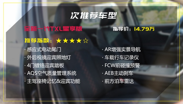 对家庭用户来说,我们第二推荐的车型是次低配星享版,车价较入门版增加8000元,得到的配置增加超过10项,在主动安全上提升的同时,便利性也得到了充分的提升,连后市场购买行车记录仪还要安装的麻烦也省了。整体的用车体验肯定是更进阶的,所以我们建议如果你想把购车预算控制在15万元内,那就考虑做这款车型,推荐指数四星。