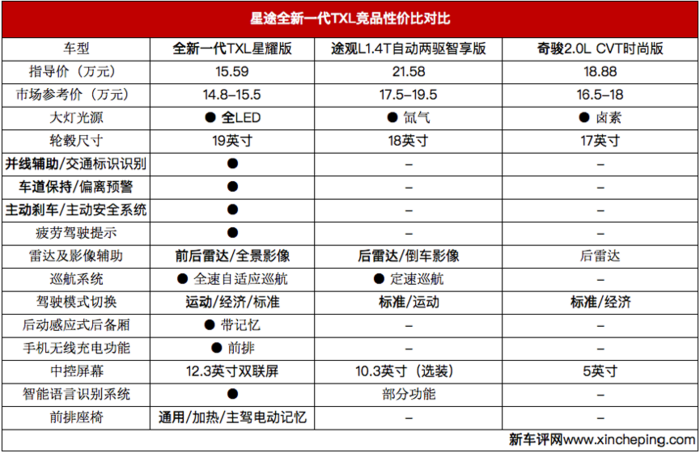 为什么我们这么肯定星途全新一代TXL星耀版值得五星推荐呢?找两个对手来比一比就知道了。车型1为上汽大众途观L (配置|询价) 1.4T自动两驱智享版,指导价21.58万元,终端参考价17.5-19.5万元,车型2为东风日产奇骏 (配置|询价)2.0L时尚版,指导价18.88万元,终端参考价16.5-18万元。后两者不仅价格高出一截,配置上也少了驾驶辅助系统、自适应巡航、多种驾驶模式、电动感应后备厢、远程启动功能、内置式行车记录仪、手机无线充电、前排座椅加热通风、主驾驶席座椅记忆、12.3英寸大中控屏和智能语音识别系统等多项科技实用功能。这样一比,星途全新一代TXL星耀版的性价比不言而喻。