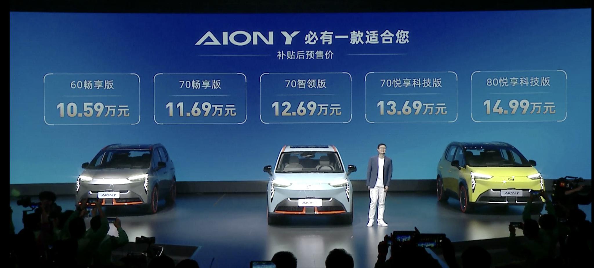 广汽埃安AION Y (配置|询价)正式开启预售,首发5款车型,预售价:10.59-14.99万元。预售时间为3月29日20:00-4月19日12:00,将于今年4月的上海车展期间正式上市。首任车主将享受终身免费三电质保。