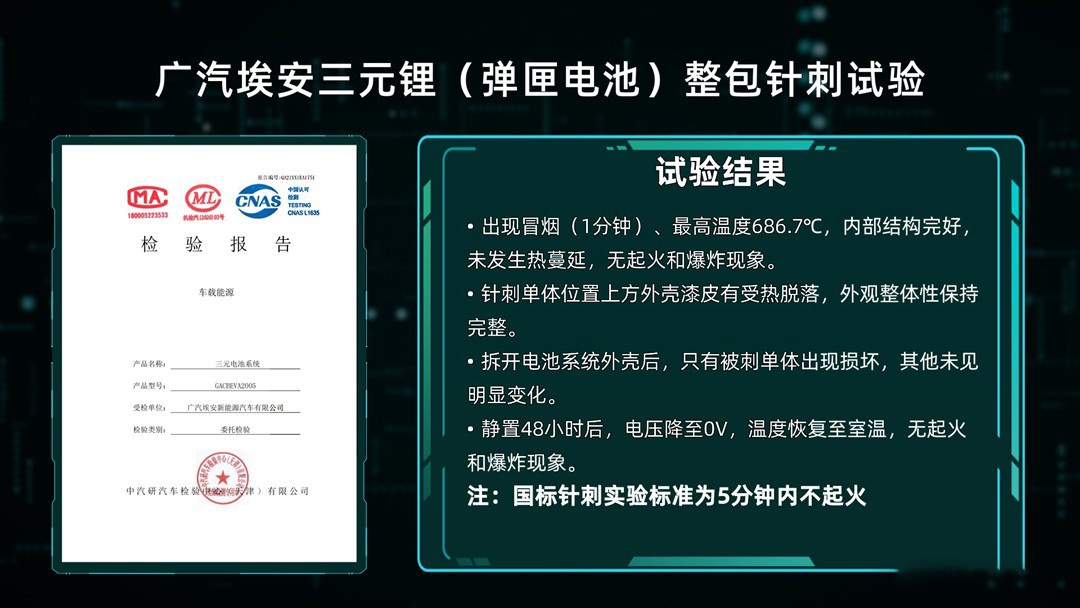 一年之后的今天,广汽埃安发布了一款新电池,它也成功通过了针刺试验,被命名为“弹匣电池”。至此,针刺试验不再是刀片电池的“专属”,广汽埃安的“弹匣电池”也行。