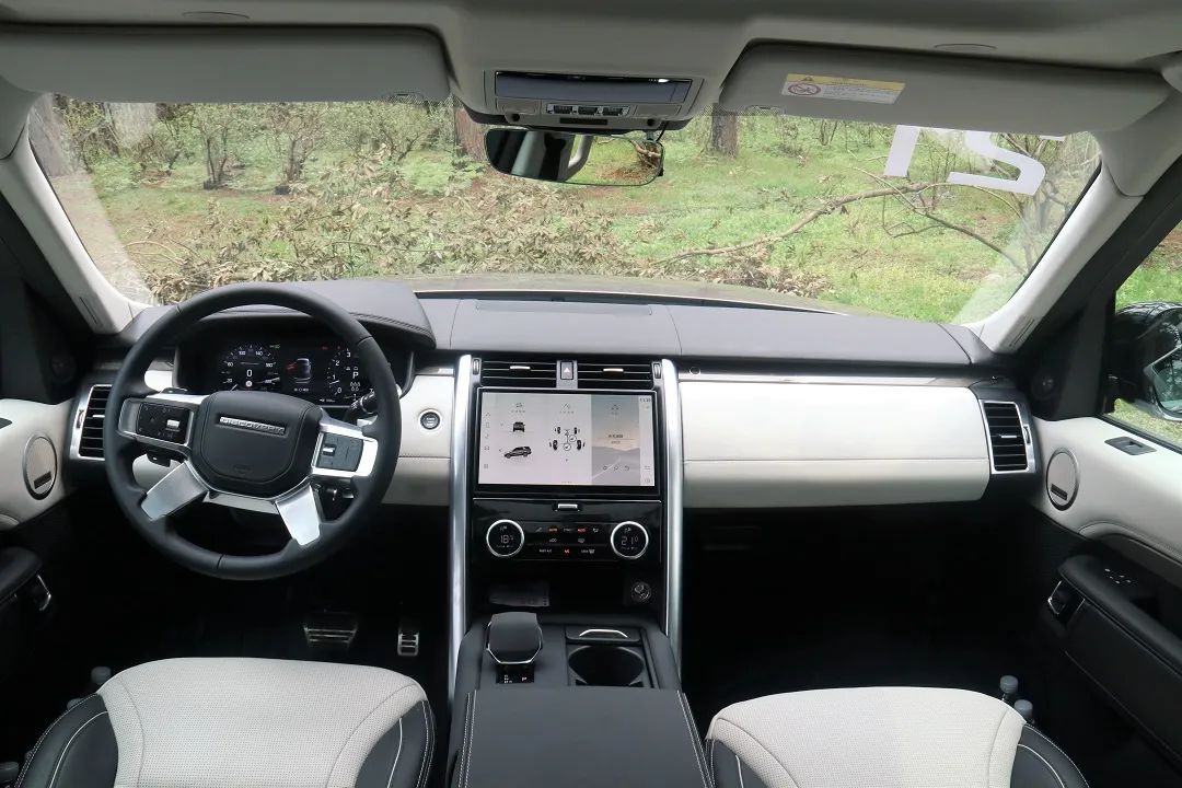 进入到车内,全新路虎发现采用四辐式多功能方向盘,相比上一代车型来说,金属面积更大,看上去更有视觉冲击感。在正前方是一块12.3英寸的全液晶仪表盘,当通电后,屏幕上会显示R DYNAMIC字样,这也是带运动套件车型的专属标识。