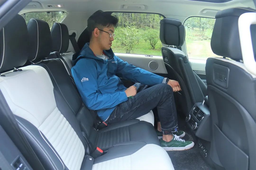 全新路虎发现还提供了第三排座椅,在保持第二排座椅前后位置不变的前提下,将椅背调至最前,进入第三排刚好坐下,但是坐姿不是很舒服。如果将第二排座椅位置调前,或者乘坐者是一个身材比较娇小的女生的话,第三排座椅空间的表现也还是可以的。