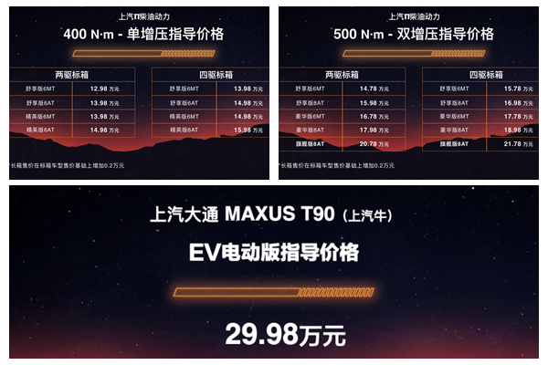 上汽大通MAXUS T90的长箱售价在标箱基础上增加2000元,柴油400N·m单增压版(标箱)售价区间为12.98-15.98万元;柴油500N·m双增压版(标箱)售价区间为14.78-21.78万元;EV电动版(国家补贴后)售价为29.98万元起。