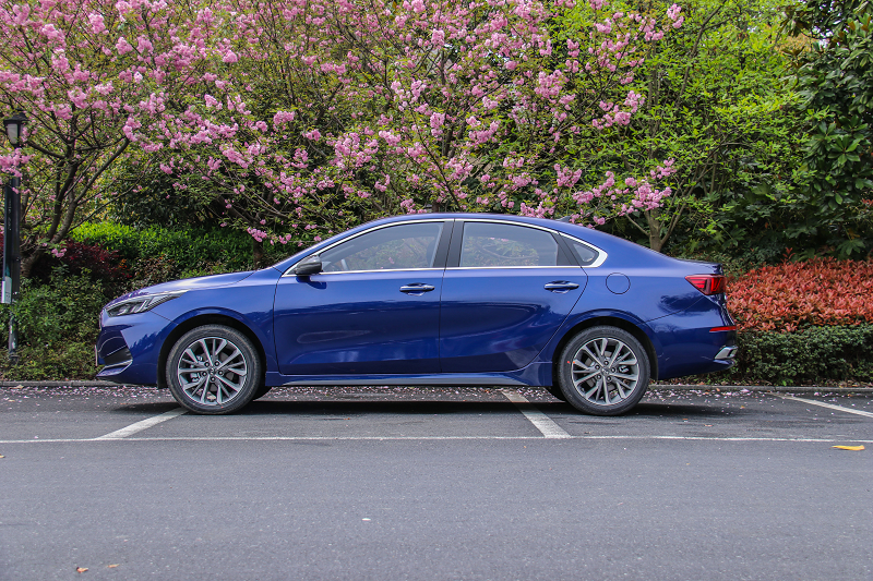 接着走到车侧,溜背式车顶造型,搭配从灯眉贯穿至车尾的腰线,让这款车显得更加修长。但除了这条腰线,起亚K3车侧没有采用过多线条设计,整体造型比较简洁,但是运动感却丝毫不减。熏黑处理后的外后视镜加上下沉式车头设计,让这台车的姿态干劲十足,而车窗周围的镀铬饰条又让这台车的干劲显得没有那么“鲁莽”。另外,起亚K3的车身尺寸在同级别中也拥有着不错的竞争力,它的长宽高分别为4660/1780/1450mm,轴距更是达到了2700mm,对车内乘坐空间表现有着直接提升。这里大家可以先保持期待,文章后面我们也对这台车的空间表现进行了实测。