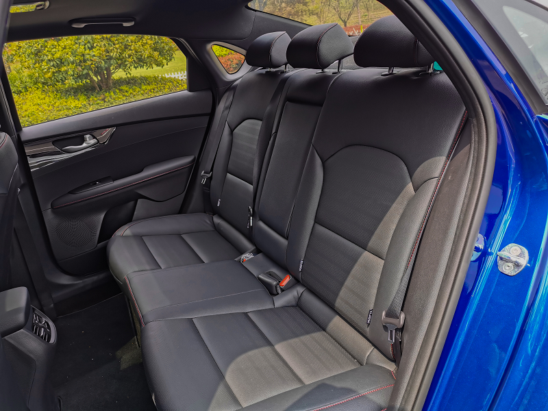 紧凑级轿车消费人群还是比较看重车辆后排空间表现的,2700mm的轴距就是起亚K3的自信。实话实说,小编块头还是比较壮的,身高175cm,并且驾驶坐姿也比较靠后。将前排调整好合适坐姿后,坐进后排腿部却并不感觉局促,还留有一拳半左右的余量。头部空间表现并没有像腿部那样出色,坐直后头部有两指左右余量。值得夸奖的是起亚K3无论是前排座椅还是后排座椅,柔软度都非常适合长途乘坐,这也为小编这一天的深度试驾体验提供了不错的舒适度。