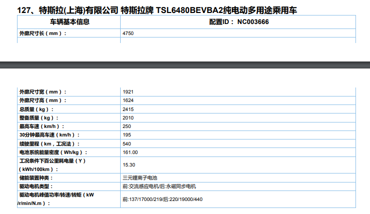 从信息来看,该版本Model Y采用了前交流感应电机、后永磁同步电机的动力组合,搭载三元锂离子动力电池,电池密度为161Wh/kg,工况法下最高续航达 540km。