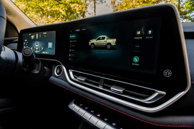 新车的内饰也很豪华,采用黑红双色作为设计基调,提升豪华感与档次感。中控台造型采用了倾向于驾驶位的非对称式设计,并配备了皮卡首次采用的双联屏设计,10.25英寸液晶仪表与12英寸中控屏无缝连接,极富科技感。