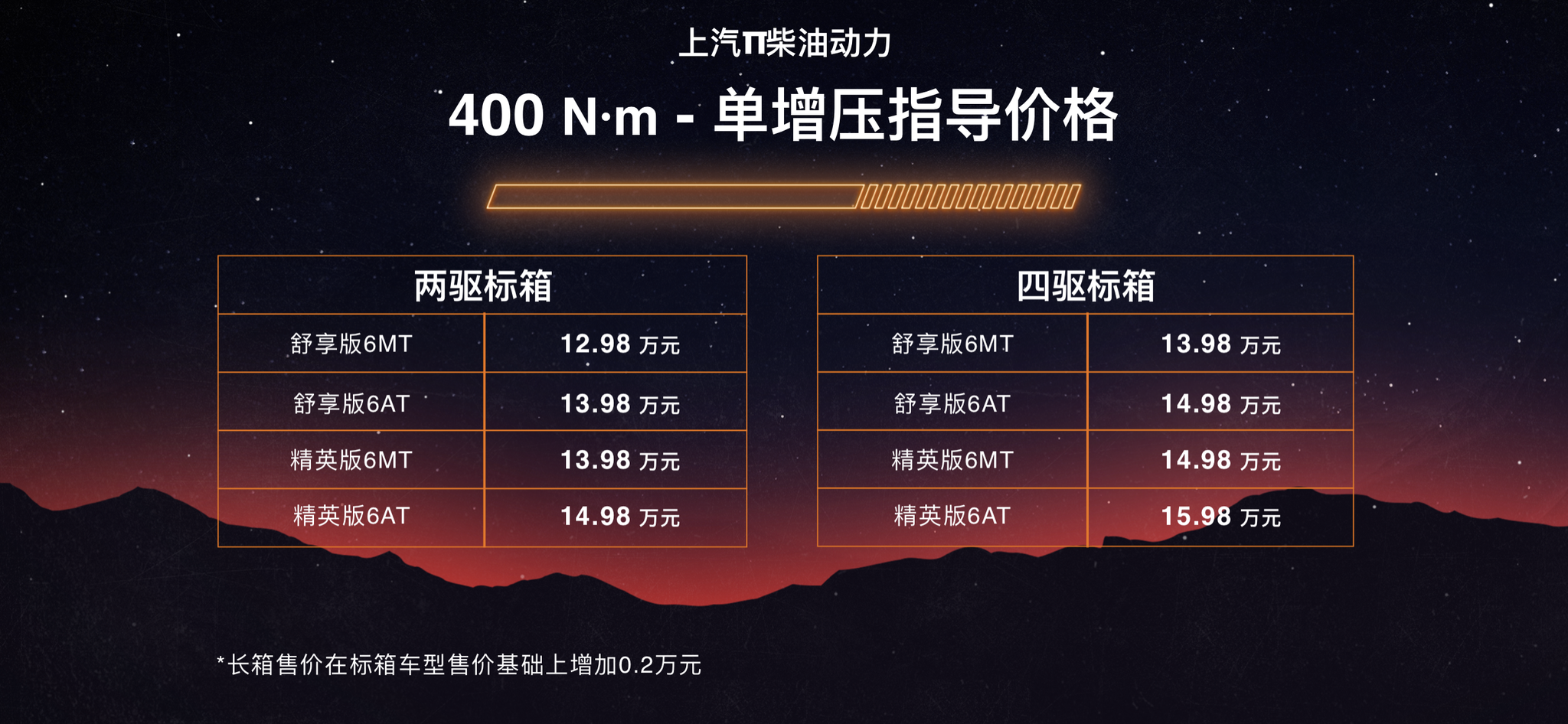 此外,“上汽牛”还有搭载上汽π单增压柴油发动机的单增压版本可选,最大功率120kW,最大扭矩400 N·m,百公里油耗仅为7.5L。