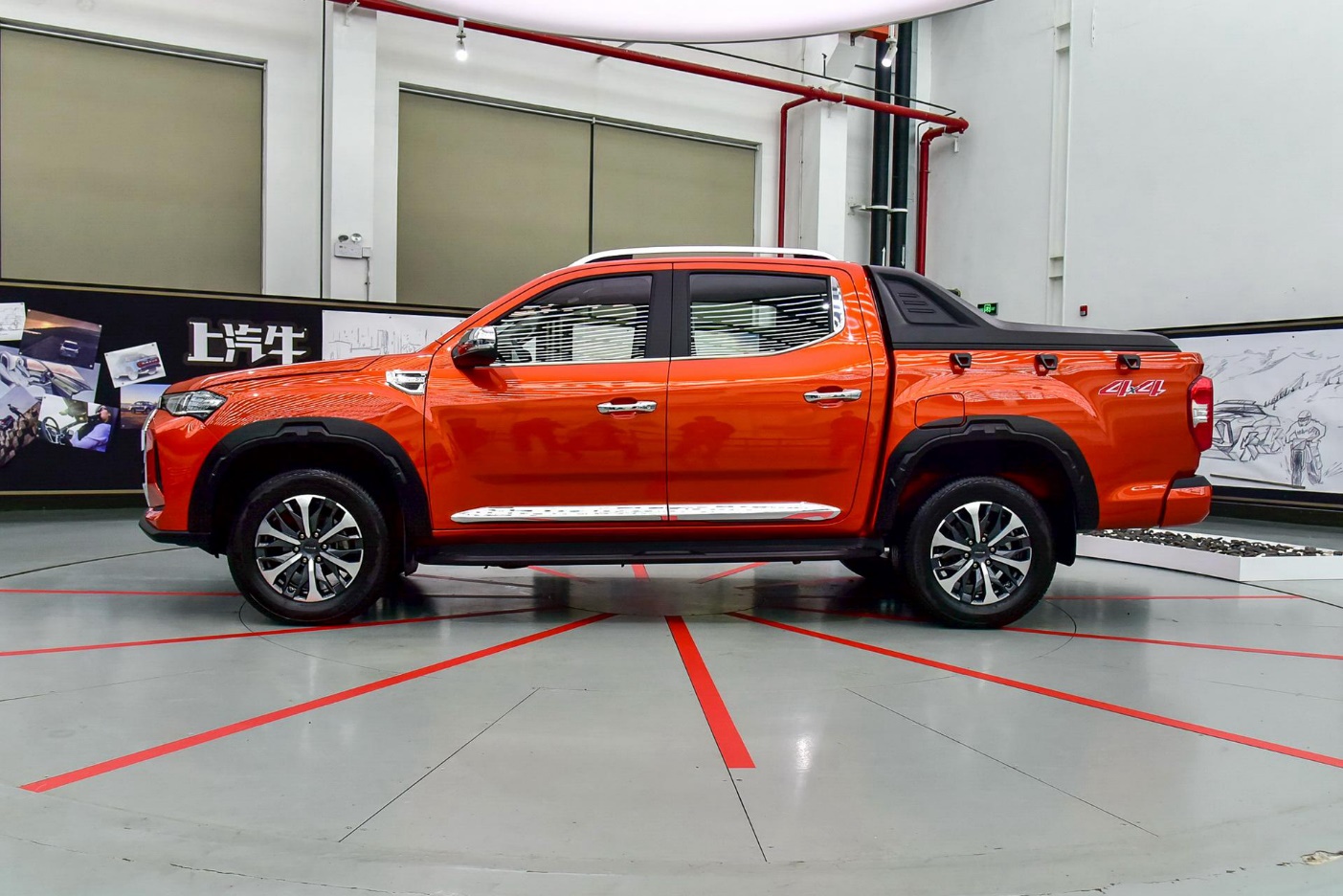 车身侧面依旧是皮卡的样式,看起来圆润不少,并且有一定的肌肉感,提供6种车身颜色,门把手也采用了镀铬设计,同时,该车还配备了车顶行李架,在视觉上增强了不少层次感,并配有后货厢龙门架。