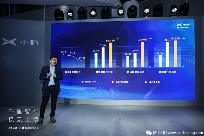 下面这个数据是我在这一次3000km挑战后,对于这个活动的总结大会上官方发布的数据。从百公里接管次数、变道超车成功率、进出匝道的成功率以及隧道通行成功率这些方面的成功率来看,NGP的新版本都超越了自己的OTA前的一个版本,同时也超越了特斯拉的NOA。