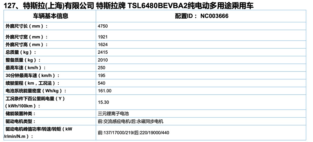 从曝光的信息来看,该车型搭载了前后双电机,前轴电机最大功率137kW,峰值扭矩219牛顿米,参数与在售的Model Y前电机相同。而后电机最大功率220kw,峰值扭矩440牛顿米,相较于在售的Model Y高性能版本后电机的最大功率202kW,峰值扭矩404牛顿米有所提升。另外,新车型的续航里程为540km,相较于在售的Model Y高性能版本的480km提升了60km。