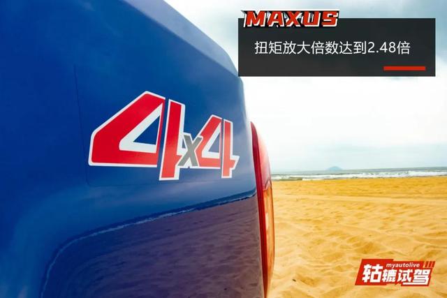 了解试驾车的越野性能后,当然要去试试真实力。此次试驾来到了日月湾的沙滩撒欢,刚开始确实玩得很高兴,可惜由于驾驶方法不恰当,加上试驾车配备公路轮胎,结果陷车了。此时上汽大通MAXUS T90的低速四驱功能派上用场了,这款车配备来自博格华纳的适时四驱模式,并支持2H/4H/4L手动调节,只需将挡位调到4L,控制好方向盘,缓慢加速,试驾车就能轻松脱困。