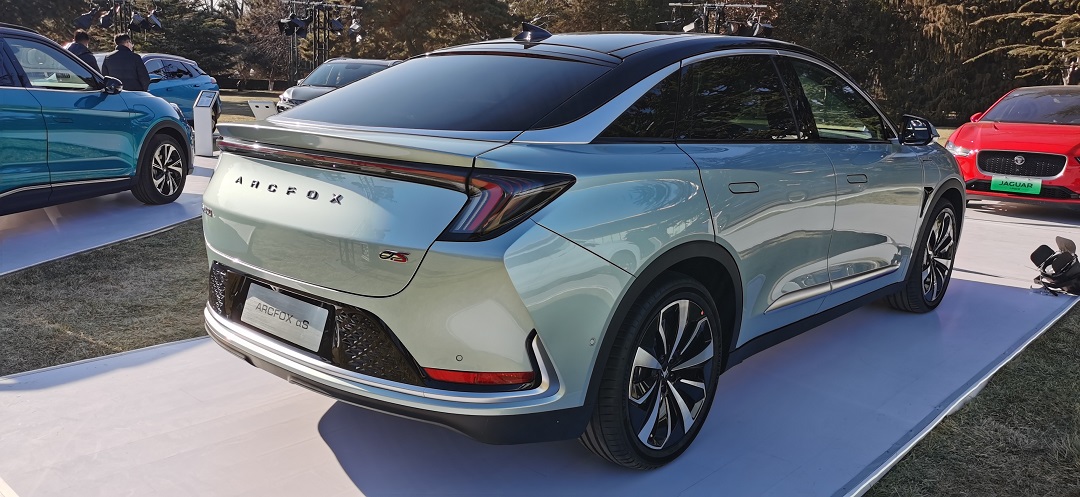 车尾部分,极狐阿尔法S的尾部造型十分简洁大气,大量的横向线条能够有效拉宽尾部的视觉宽度,看上去也更有运动气息。两侧大灯造型十分像“回旋镖”,并且在周边进行了熏黑处理,搭配上方上翘的“鸭尾”设计,能够增强车尾的运动属性。