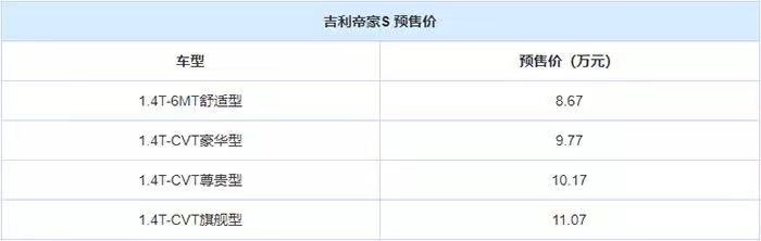 在帝豪、帝豪GS这些车型都得到市场的认可之后,吉利官方又给帝豪家族增加了一个新的成员,那就是帝豪S。今天,吉利汽车宣布全新车型帝豪S正式开启预售,共推出4款车型,预售价为8.67-11.07万元。详细车型售价信息,请看下图: