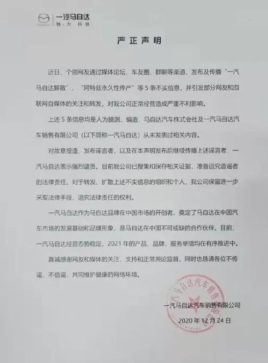 虽说一汽集团和马自达“分手”成为今天热议的话题,但这并不是一件令人特别意外的事情。其实早在去年年底一汽马自达就有关于解散的传闻,官方曾直接发表声明称这类传闻实属“谣言”。
