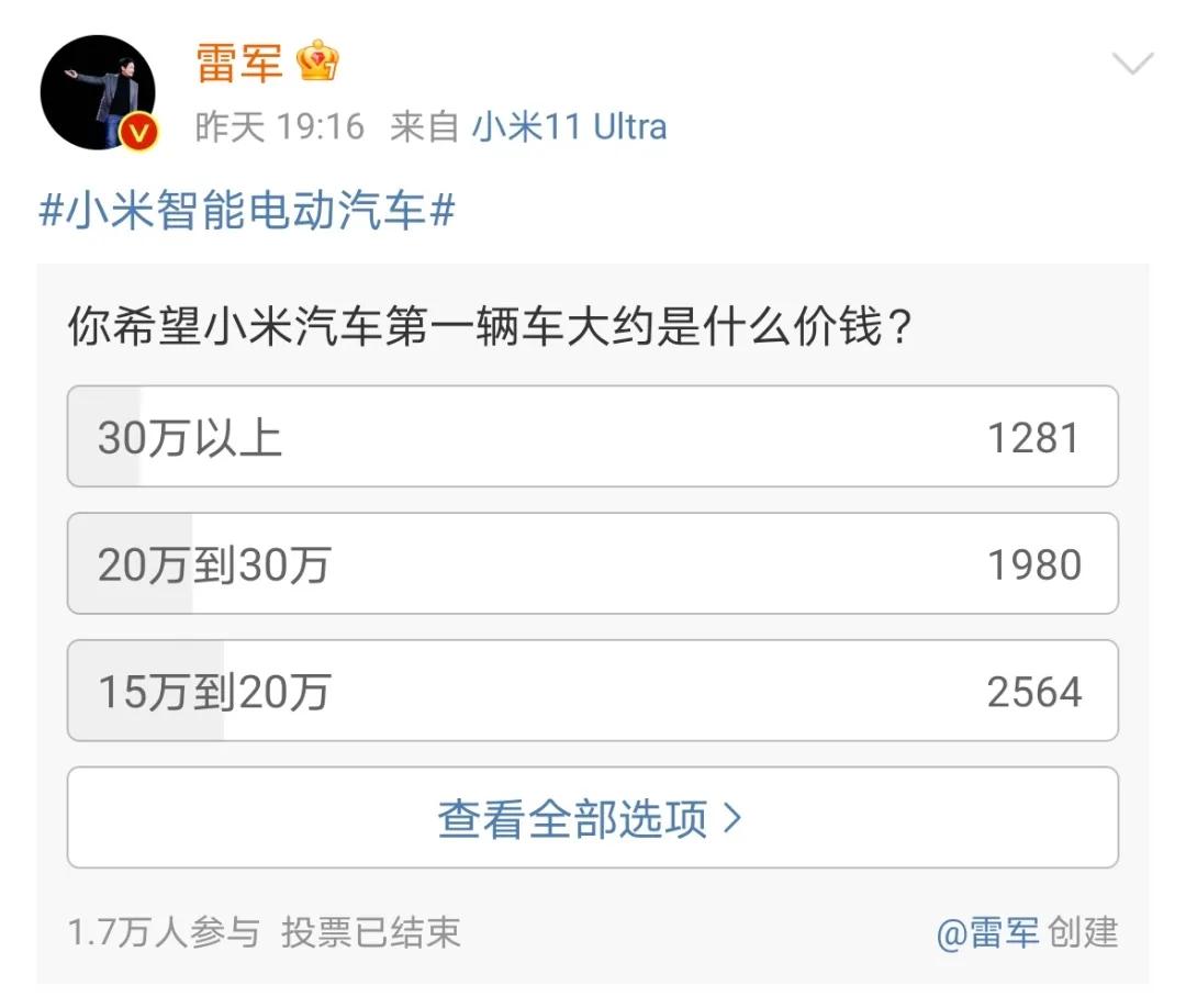 雷军本人近日也在微博发起了头条,征集网友对小米首款车型定位的意见信息,绝大部分网友更偏向于10万元以内的轿车,而在直播间雷军也透露,小米首款车型会是轿车或SUV,不太可能是此前所说的“年轻人的第一台跑车”,倘若小米的首款量产车型真是10万元内的轿车,那么确实很符合小米的亲民风格。